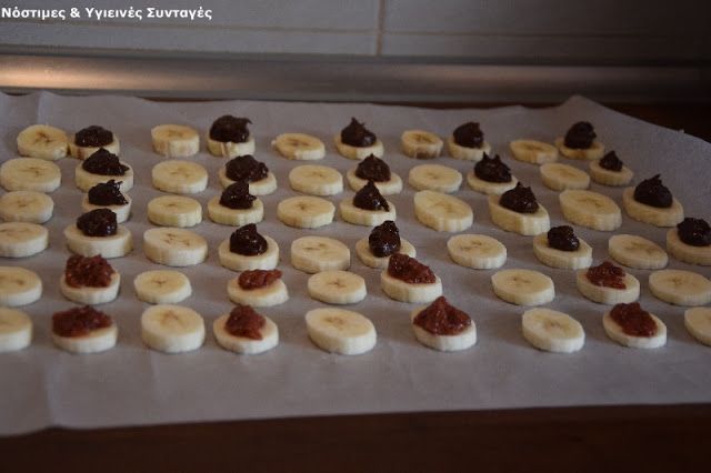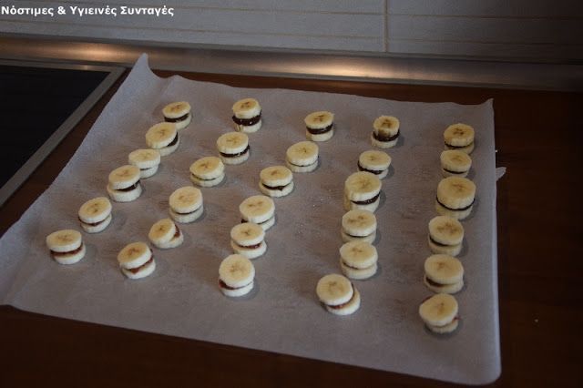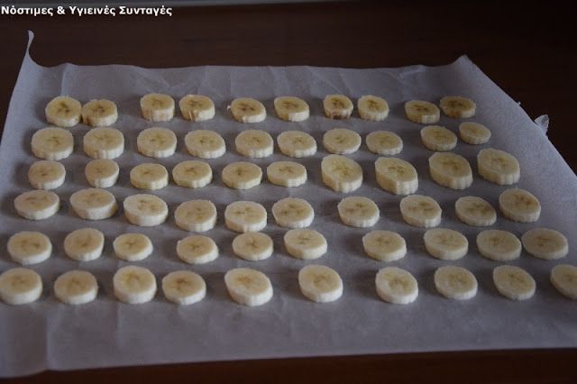 1. Τοποθετούμε λαδόκολλα στον πάγκο της κουζίνας. Κόβουμε τις μπανάνες σε λεπτές φέτες και τις τοποθετούμε στη λαδόκολλα ανά 2. Σας προτείνω να μην ακολουθήσετε το σχήμα της μπανάνας αλλά να κόψετε- ισιώσετε τις άκρες