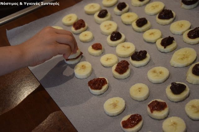 3. Τοποθετούμε τις φέτες μπανάνας από πάνω ώστε να γίνουν σάντουιτς. Προσοχή, δεν πιέζουμε. (όπως βλέπετε εμένα με βοήθησε η Σοφία – φτιάξτε το και εσείς με τα παιδιά σας αν θέλετε)