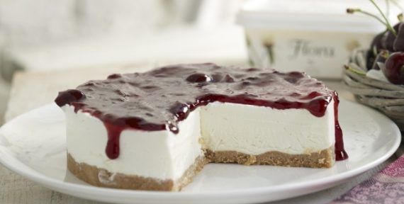 Υλικά 400 γρ. φρυγανιά τριμμένη 200 γρ. Flora Soft με βούτυρο λιωμένο 150 γρ. ζάχαρη άχνη 200 γρ. κρέμα τυριού 400 – 500 γρ. παγωτό βανίλια ή παγωτό γιαούρτι Ξύσμα από 1 μοσχολέμονο Μαρμελάδα βύσσινο για την επικάλυψη 1 βανιλέτα Alsa