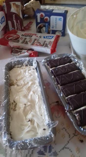 1 φυτική σαντιγί(ερμόλ) 1 ζαχαρούχο γάλα 1εβαπορε 1 φακελάκι σκόνη σαντιγί 1/2 φλ.τσ.γάλα πλήρες 2 κουβερτούρες 3 σοκοφρέτες 5 γαλακτοφέτες.