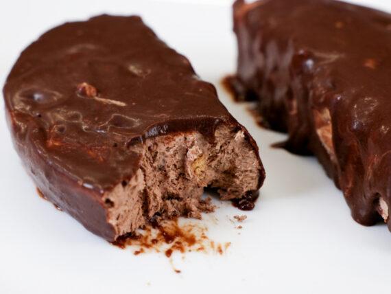 Κόβουμε το παγωτό σε φέτες και τις βουτάμε στην χλιαρή σοκολάτα. Τις τοποθετούμε σε αντικολλητικό χαρτί και αφήνουμε για 1 ώρα στην κατάψυξη πριν σερβίρουμε.