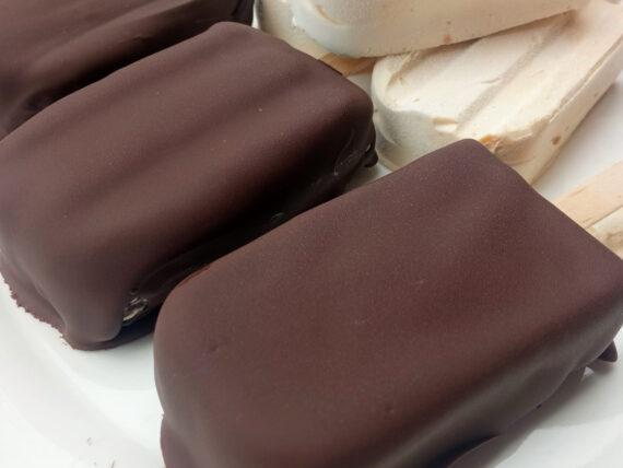 Βάζουμε τα παγωτά για όλο το βράδυ στην κατάψυξη. Την επόμενη μέρα λιώνουμε την κουβερτούρα σοκολάτας σε μπεν μαρί και βουτάμε τα παγωτά στην λιωμένη κουβερτούρα. Αφήνουμε τα παγωτά να παγώσουν τελείως στην κατάψυξη και απολαμβάνουμε.