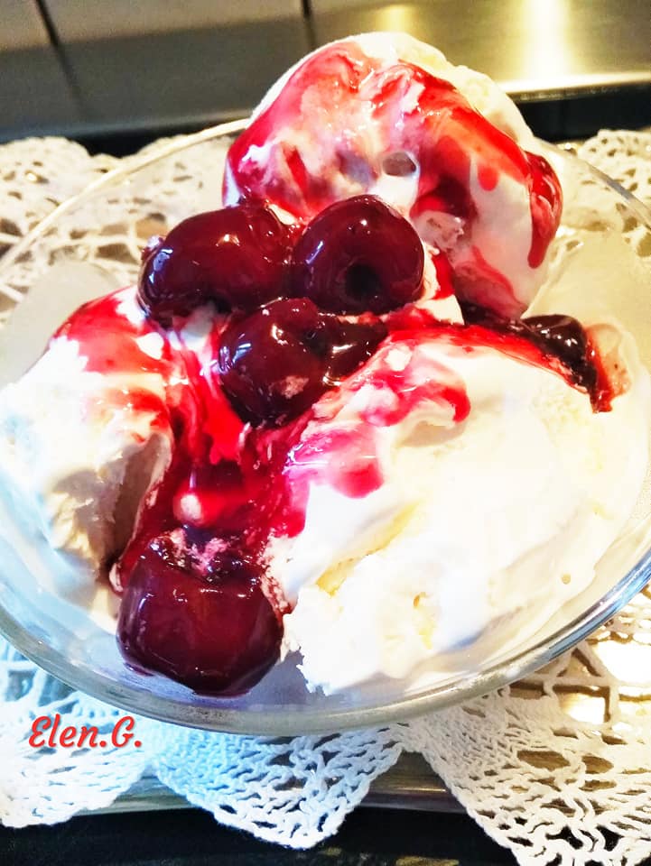 Υλικά Ένα κουτί φυτική σαντιγί στη χάρτινη πράσινη συσκευασία με το χωνί του ενός λίτρου Ένα κουτί γάλα εβαπορέ μεγάλο Δυο κρόκους αυγών 500ml νερό 300 γραμμάρια ζάχαρη ή 200 γραμμάρια φρουκτόζη που βάζω εγώ επειδή αποφεύγω τη ζάχαρη Ένα κουταλάκι του γλυκού μαστίχα σκόνη Γλυκό του κουταλιού κεράσι για σερβίρισμα