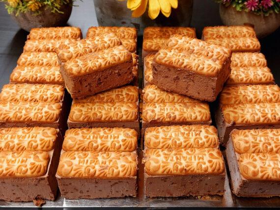1200g cream 35% fat 400g couverture or milk couverture or mix 70g powdered sugar 100g of truffle 2 large packages of cookies Pan 25×35 ************************************************** Το παγωτό μπορεί να καταναλωθεί χωρίς να γίνει σάντουιτς. κόβουμε ανά δύο αλλά μπορούμε να κόψουμε και ανά ένα. The ice cream can be eaten without being made into a sandwich. we cut by two but we can also cut by one.