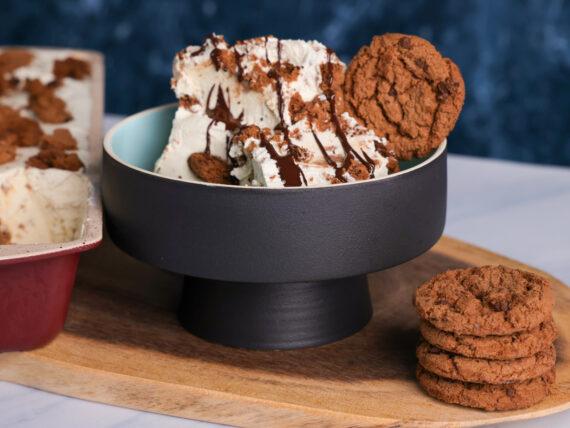 Συνταγή για αφράτο και εύκολο σπιτικό παγωτό με γεύση soft king cookies χωρίς παγωτομηχανή, με 5 υλικά, που μένει αφράτο για μέρες χωρίς να κρυσταλλώνει. Σερβίρεται με σοκολάτα σιρόπι. Από τους φίλους μας Foodaholics.