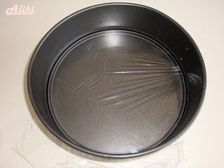 Σε μια φόρμα με αποσπώμενο πάτο διαμέτρου 27 εκατοστών καλύψτε με αλουμινόχαρτο, ή πλαστική μεμβράνη κάτω, όπως στη φωτογραφία.