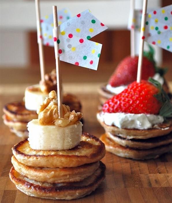 Φτιάξτε μίνι ορεκτικά για τα παιδιά με τηγανίτες και φρούτα.