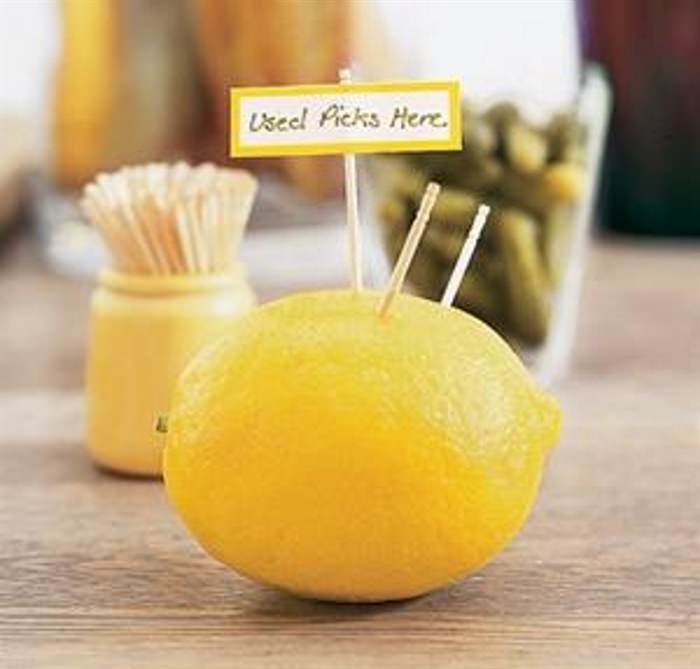 Χρησιμοποιημένες οδοντογλυφίδες Σε ένα δείπνο, αφήστε ένα λεμόνι στο τραπέζι για τους καλεσμένους να τοποθετούν τις χρησιμοποιημένες οδοντογλυφίδες τους. Στο τέλος, μπορείτε να πετάξετε το λεμόνι