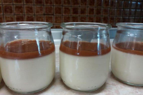 Το βάζουμε σε μπολάκια ή σε γυάλινα βαζάκια. Τα αφήνουμε να κρυώσουν λίγο και τα τοποθετούμε στο ψυγείο για τουλάχιστον πέντε ώρες. Έπειτα, βάζουμε από πάνω την καραμέλα γάλακτος και σερβίρουμε. Χρησιμοποίησα έτοιμη καραμέλα γάλακτος σε βαζάκι. Μπορείτε να χρησιμοποιήσετε αντί για την καραμέλα οποιοδήποτε σιρόπι.