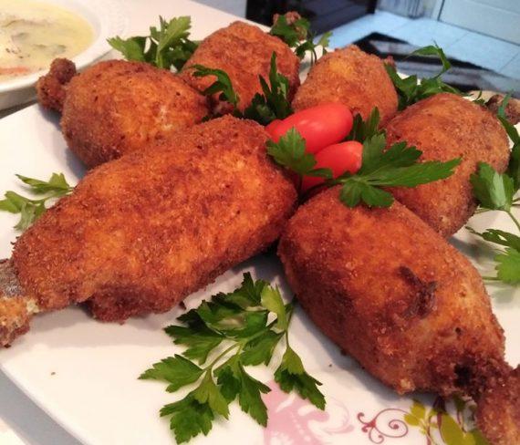 Έβρασα τα μπουτάκια κοτόπουλο με τις πατάτες και τα καρότα το ζουμί του έκανα σούπα αυγολέμονο το κρέας το χώρισα από τα κόκαλα και το έκοψα κομματάκια. Έλιωσα και τις πατάτες και δύο από τα καρότα. Έριξα αλάτι, πιπέρι, λίγο μοσχοκάρυδο, μία κούπα γκούντα, μία κούπα γραβιέρα τα έκανα ζύμη και τα χώρισα σε έξι μέρη. Έβαλα ενδιάμεσα το κόκκαλο τα πέρασα από αλεύρι αυγό και φρυγανιά και τα τηγάνισα σε μπόλικο ηλιέλαιο.
