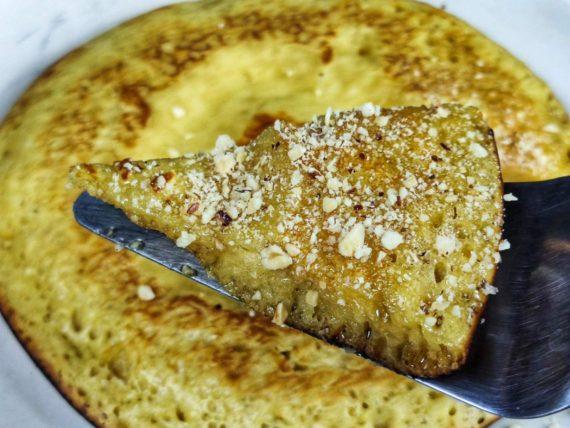 Χαμηλώστε τη θερμοκρασία στο μέτριο και ψήστε για ακόμα 2 λεπτά. Ξεκαπακώστε και μπήξτε μια οδοντογλυφίδα στο pancake. Αν βγει καθαρή, είναι έτοιμο. Αν θέλετε να πάρει χρώμα και από την άλλη μεριά απλά γυρίστε το με τη βοήθεια ενός πιάτου (όπως σας δείχνω και στο βίντεο). Αφήστε για 1 λεπτό και βγάλτε σε ένα πιάτο.