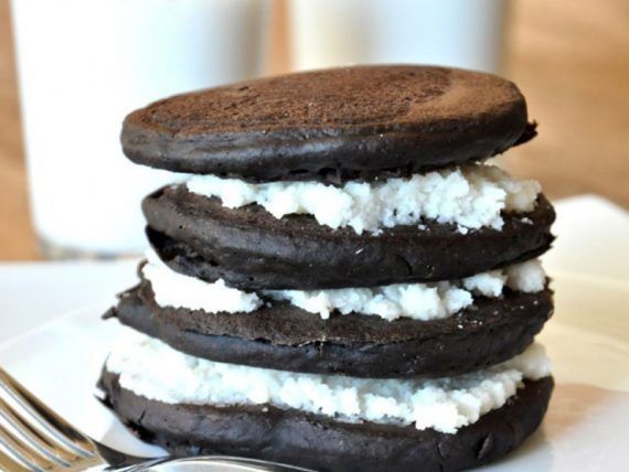 Ξεκίνα με την γέμιση. Εν προκειμένω το frosting καρύδας. Χτυπάς καλά σε ένα mixer το τριμμα καρύδας μέχρι να πάρουν σχετικά κρεμώδη υφή. Προσθέτεις την βανίλια και την ζάχαρη και χτυπάς καλά. Στην συνέχεια προσθέτεις σιγά – σιγά το γάλα καρύδας μέχρι να έχεις ένα κρεμώδες αλλά πηχτό αποτέλεσμα. . Βαζεις το ενα πανω στο αλλο με frosting ανάμεσα για να μοιάζουν με γιγαντιαία μπισκότα Oreo.