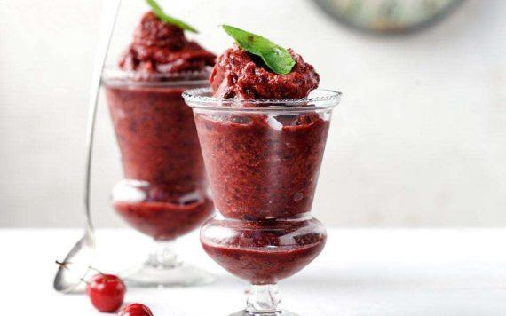 Μετά τις 2 ώρες, βγάζουμε τα κεράσια από την κατάψυξη και το σιρόπι από το ψυγείο και τα ρίχνουμε στο μπλέντερ. Αν δεν χωράνε όλα μαζί στο μπλέντερ, τα βάζουμε σε δόσεις.