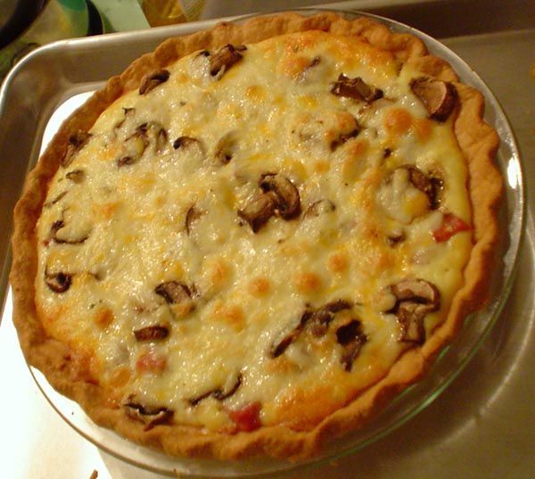Υλικά συνταγής 1 φύλλο σφολιάτας 10 φέτες ζαμπόν κομμένες σε κυβάκια 10 φέτες μπέικον κομμένες σε φέτες 10 φέτες τυρί του τοστ κομμένες σε κυβάκια 150 γρ. τυρί τσένταρ τριμμένο 400 γρ. μανιτάρια φρέσκα κομμένα σε φέτες 200 ml κρέμα γάλακτος 1 αυγό χτυπημένο 3 κ.σ. ελαιόλαδο [*]αλάτι πιπέρι
