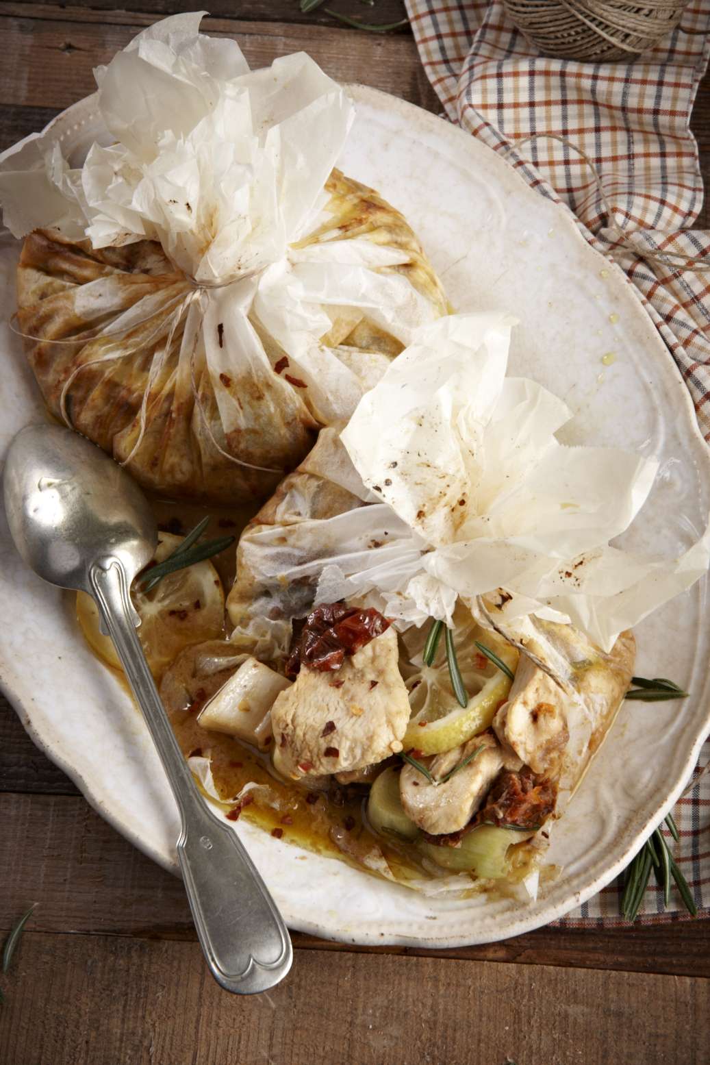 λεμονιού και να στραγγίξετε κάθε δόση από τα πολλά υγρά, αφήνοντας μια μικρή ποσότητα (1-2 κουτ. σούπας). Ενώνετε τις άκρες κάθε λαδόκολλας και στερεώνετε με σπάγκο ψησίματος δημιουργώντας 4 πουγκιά.