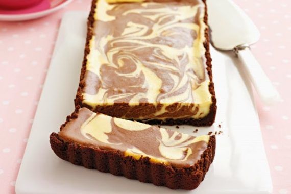6.Με ένα κουτάλι ρίχνετε εναλλάξ πάνω στη μπισκοτένια βάση μια κουταλιά από το σοκολατί μείγμα και μια κουταλιά από το λευκό μείγμα τυριού. Στη συνέχεια χρησιμοποιώντας την άκρη του κουταλιού ανακινείτε επιφανειακά τα δύο μείγματα για να δημιουργήσετε “κυματισμούς”.