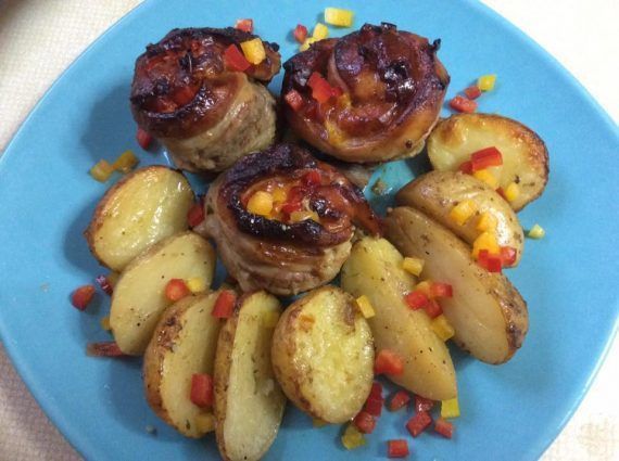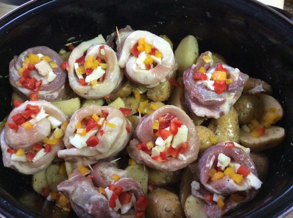 Εκοψα μικρες φρεσκιες πατατες με τις φλουδες,τις πασαλειψα με μουσταρδα,αλατοπιπερο ,ριγανη σκορδο και τα εβαλα ολα στη γαστρα