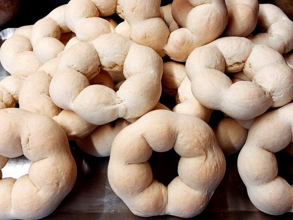 Προθερμαίνουμε τον φούρνο στους 160 βαθμούς Κελσίου, στις αντιστάσεις, πάνω κάτω. Παίρνουμε ένα κομμάτι ζύμης και το πιέζουμε όπως θα δούμε στο βίντεο. Ανοίγουμε το ζυμάρι σε κορδόνι 20 εκατοστών. Με το χέρι μας πιέζουμε το κορδόνι, αλλά όχι μέχρι κάτω, για να του κάνουμε το σχέδιο. Ενώνουμε προσεκτικά τις δύο άκρες.