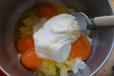 Σε ένα λεκανάκι τρίβετε με το χέρι την φέτα,το αναμιγνύεται με το γιαούρτι,το λάδι,κ τα αυγά,αφού ενώσετε τα υλικά προσθέστε το μπεκιν παουντερ με το αλεύρι λίγο λίγο,να γίνει μια μαλακιά ζύμη να στέκετε στο κουτάλι .