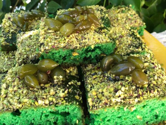 Κρατάμε λίγο από το φιστίκι Αιγίνης για την επικάλυψη και ψήνουμε στον φούρνο μέχρι να βγει το μαχαίρι καθαρό. Γαρνίρουμε με τα φιστίκια Αιγίνης που βάλαμε στην άκρη και το γλυκό του κουταλιού φιστίκι και απολαμβάνουμε.