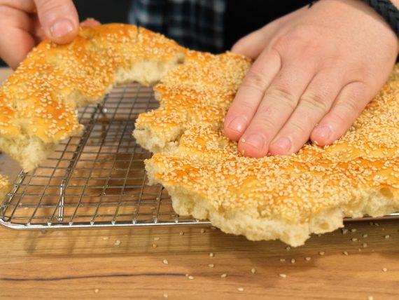 Σε ένα μπολάκι βάζουμε το μέλι μαζί με λίγο νερό και ανακατεύουμε μέχρι να διαλυθεί το μέλι. Αλείφουμε όλη την επιφάνεια της ζύμης και με τα δάχτυλά μας κάνουμε βαθουλώματα σε όλη την επιφάνεια. Πασπαλίζουμε με μπόλικο σουσάμι και ψήνουμε σε προθερμασμένο φούρνο στον αέρα 20 λεπτά στους 180 βαθμούς Κελσίου.