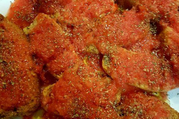 Στην αρχή κόβουμε το ψωμί σε φέτες ή σε μπουκιές και το ρίχνουμε σε ένα πιάτο. Πλένουμε τις ντομάτες και τις κόβουμε στη μέση. Στη συνέχεια τις τρίβουμε στη χοντρή πλευρά του τρίφτη και περιχύνουμε τον χυμό τους στο ψωμί. Προσθέτουμε το ελαιόλαδο, το ξύδι, το αλάτι, το πιπέρι και μπόλικη ρίγανη!