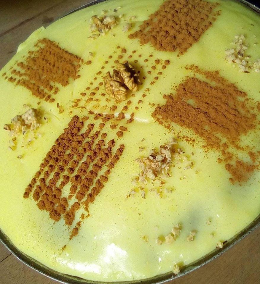 Βάζουμε στην κατσαρόλα το γάλα με 6 κουταλιές της σούπας ζάχαρη να ζεσταθεί. Ρίχνουμε το κορν φλαουρ με 2 κουταλιές της σούπας γεμάτες αλεύρι ανακατεύουμε και όταν πήξει την κατεβάζουμε και προσθέτουμε την βανίλια και το βούτυρο. Όταν κρυώσει την χτυπάμε με το μίξερ και ρίχνουμε μέσα 1 ποτήρι σαντιγί χτυπημένη ανακατεύουμε απαλά και την τοποθετούμε πάνω στο γλυκό. Τέλος ρίχνουμε πάνω κανέλα και καρύδια!