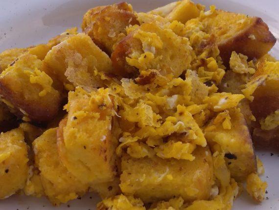 Τότε που δεν πετούσαν τίποτε και το μπαγιάτικο ψωμάκι γινόταν ένας εξαίσιος μεζές για να χορτάσει την οικογένεια!Προφανώς ούτε και η ίδια γνώριζε την καταγωγή αλλά ούτε και την ονομασία αυτής της τεχνικής (του καψαλισμένου ψωμιού σε διάφορες εκδοχές)