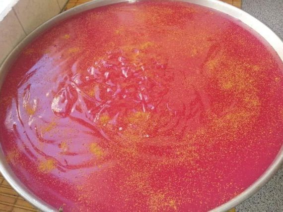 Αρχικά βάζουμε το νερό σε μία κατσαρόλα μαζί με την ζάχαρη. Μόλις αρχίσει να βράζει ρίχνουμε το νισεστέ, τον οποίο τον έχουμε αραιώσει σε 1 μεγάλο ποτήρι νερό. Ανακατεύουμε συνεχώς και ρίχνουμε και το κόκκινο χρώμα ζαχαροπλαστικής.