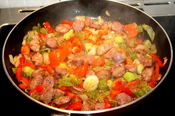 Για αρχή σοτάρουμε σε ένα βαθύ τηγάνι τις πιπεριές και τα πράσα, ώσπου να χάσουν τα περισσότερα υγρά τους. Στη συνέχεια, ρίχνουμε το κρεμμύδι και συνεχίζουμε το σοτάρισμα μέχρι να μαλακώσει το κρεμμύδι μας.