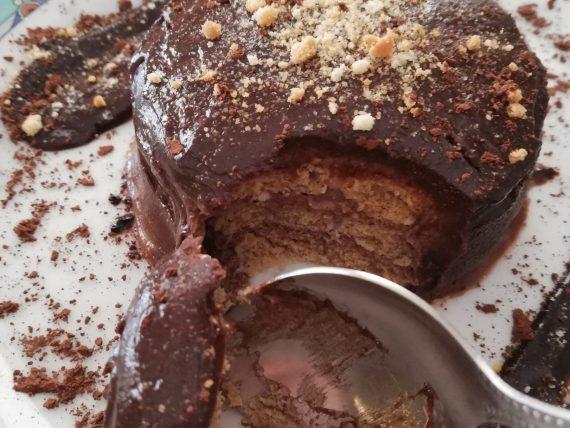 Αφού τελειώσουμε με το χτίσιμο της πάστας καλύπτουμε όλη την πάστα με την κρέμα γιαουρτιού. Συνεχίζουμε την διαδικασία μέχρι να τελειώσουν τα μπισκότα και η κρέμα. Ξεκινάμε να φτιάχνουμε την γκανάζ.