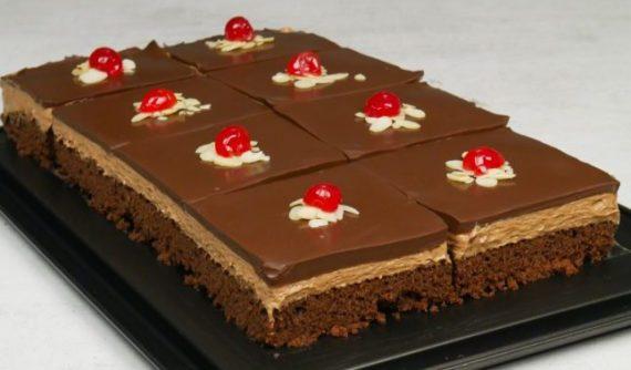 Χτυπάμε τα αυγά με την ζάχαρη να αφρατέψουν. Προσθέτουμε το γάλα (200 ml), το σπορέλαιο και συνεχίζουμε το ανακάτεμα. Κοσκινίζουμε το αλεύρι που φουσκώνει μόνο του, το κακάο, τις βανίλιες και αναμειγνύουμε να γίνουν ζύμη. Την απλώνουμε σε φόρμα 38×20 εκατοστά και ψήνουμε στους 180 βαθμούς για 10-15 λεπτά. Ελέγχουμε με μία οδοντογλυφίδα αν είναι έτοιμο. Χτυπάμε την κρύα κρέμα γάλακτος σε σαντιγί και ενσωματώνουμε την πραλίνα φουντουκιού. Τρυπάμε πολλή καλά το κρύο παντεσπάνι με ένα ξυλάκι και ραντίζουμε με το γάλα (150 ml). Απλώνουμε την μους και αφήνουμε στο ψυγείο για 4 ώρες. Κόβουμε σε μικρά κομμάτια την σοκολάτα και από πάνω ρίχνουμε την καυτή κρέμα γάλακτος. Αφήνουμε για 2-3 λεπτά και ανακατεύουμε να ομογενοποιηθούν. Την απλώνουμε πάνω από το γλυκό και βάζουμε στο ψυγείο για 1 ώρα πριν σερβίρουμε. Σερβίρουμε με φιλέ αμύγδαλα και μαρασκίνο.