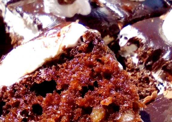 Στην αρχή χτυπάμε τα αυγά και την ζάχαρη. Ανακατεύουμε το αλεύρι που φουσκώνει μόνο του, το μπέικιν πάουντερ, την βανίλια, το κακάο την κανέλα και το γαρίφαλο σε ένα μπολ και τα ρίχνουμε σιγά – σιγά στο μείγμα με τα αυγά και την ζάχαρη. Στο τέλος, σταματάμε το μίξερ και ρίχνουμε απαλά και τα καρύδια. Ανακατεύουμε με μία μαρίζ.