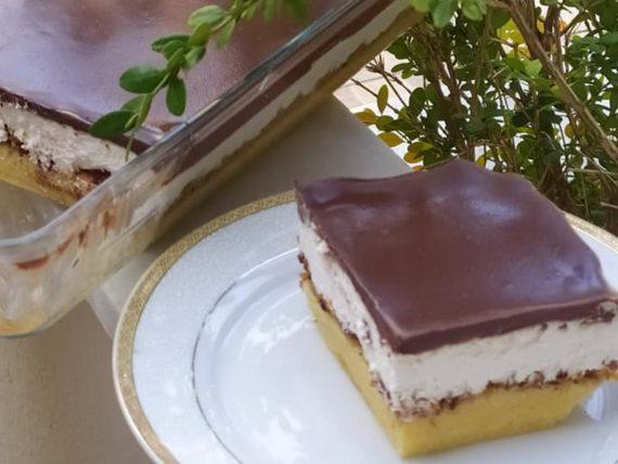 Λαχταριστή πάστα ταψιού με καβουρδισμένα αμύγδαλα, λευκό παντεσπάνι, σαντιγί και γλάσο σοκολάτας. Το τέλειο γλυκό.