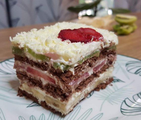 Θέλετε ένα δροσερό γλυκό ψυγείου με φρούτα της εποχής; Τότε σήμερα σας έχουμε την συνταγή που ψάχνατε. Μία απολαυστική πάστα ταψιού σε πυρέξ με πτι μπερ μπισκότα με γεύση σοκολάτας. κρέμα με τυρί μασκαρπόνε, μπανάνες, φράουλες, ακτινίδια και στο γαρνίρισμα τριμμένη λευκή σοκολάτα.