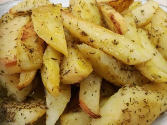 Καθαρίζουμε και κόβουμε τις πατάτες Ανακατεύουμε όλα τα υπόλοιπα υλικά και περιχύνουμε τις πατάτες. Ανακατεύουμε με τα χέρια μας για να μαρινάρουμε όλες τις πατάτες. Ψήνουμε σε προθερμασμένο φούρνο στους 180º C για 45 λεπτά περίπου ή μέχρι να ροδίσουν οι πατάτες.
