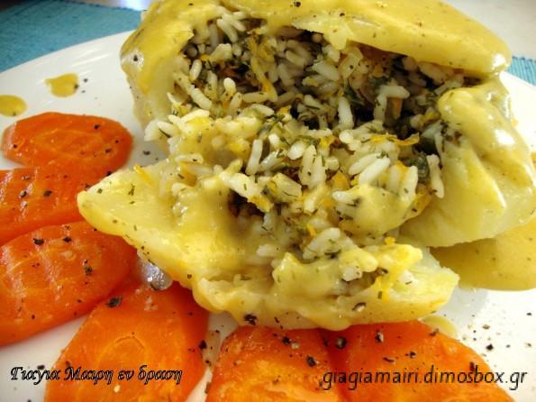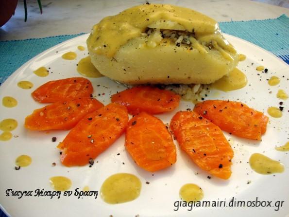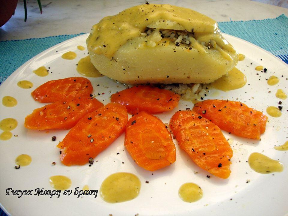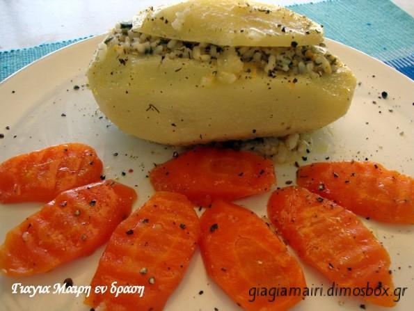 υλικά γέμισης 8 πατάτες μεγάλες 1 μεγάλη πατάτα σε κύβους 4 κσ κίτρινο ρύζι 4 κσ ρύζι γλασέ 1 κούπα άνηθο κρεμμυδάκια 5-6 φιλαράκια δυόσμο ψιλοκομμένα 1 μεγάλο κρεμμύδι χοντροκομμένο 2 καρότα ψιλοτριμμένο ζωμό λαχανικών