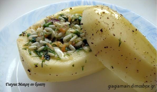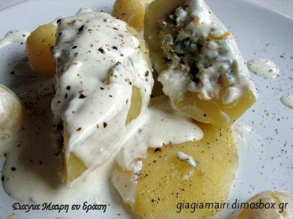 υλικά για την σως μια κούπα φέτα τριμμένη 4 κουταλιές γιαούρτι αλατι πιπέρι εκτέλεση Καθαρίζουμε τις πατάτες κόβουμε μια λεπτή φετούλα από την πλατιά της επιφάνεια για να εχουμε το καπάκι. Με ένα κουταλάκι σιγά σιγά αδειάζουμε τις πατάτες. ΠΡΟΣΟΧΗ μην σκάψετε πολύ τις πατατούλες σας γιατί θα σας ανοίξουν στο βράσιμο. Ετοιμάζουμε την γέμιση βάζοντας όλα τα υλικά μαζί. Γεμίζουμε τις πατάτες μας όχι μέχρι επάνω γιατί θα φουσκώσει το ρύζι. τις βάζουμε στην κατσαρόλα προσθέτουμε 2 κούπες ζεστό νερό για να βράσουν μπορεί να χρειαστούν κι άλλο νεράκι. Βράζουμε σε πολύ σιγανή φωτιά. Όταν είναι έτοιμες παίρνουμε το ζουμί από την κατσαρόλα και το βάζουμε στο μουλτι και προσθέτουμε την φέτα’ και 4 κουταλιές γιαούρτι τα λιώνουμε και περιχύνουμε τις πατάτες προσοχή!!!! να βράσουν σε χαμηλή φωτιά!