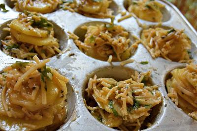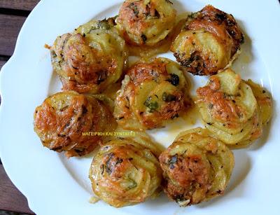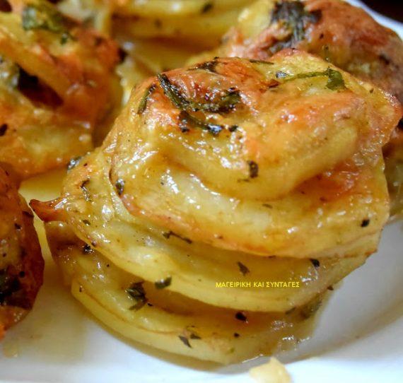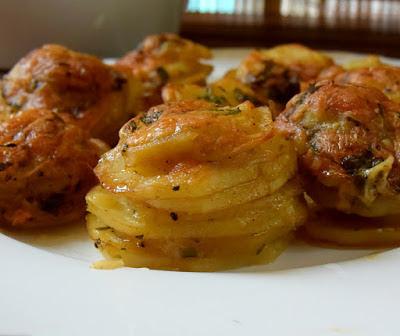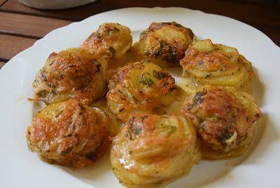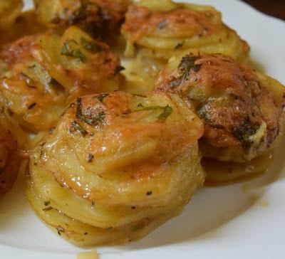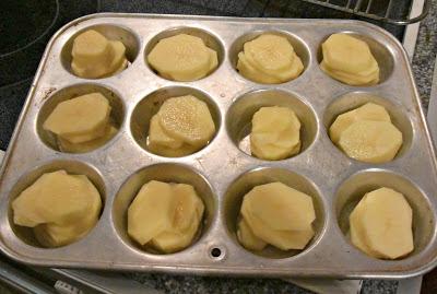Αρχίζουμε και στοιβάζομαι μέσα στις βουτυρωμένες θηκούλες η οποίες καλό θα είναι να είναι αντικολλητικές –εγώ κόλλησα λίγο — τις πατάτες προσέχοντας να βάζουμε από κάτω τις μεγαλύτερες σε μέγεθος κι επάνω επάνω τις πιο μικρές σχηματίζοντας βουναλάκι . Οτι περισσέψει από το μείγμα το βάζουμε σε όλες τις πατάτες από πάνω στο τέλος ..