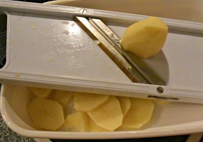 Καθαρίζουμε απ έξω τις πατάτες τις πλένουμε και τις κόβουμε λεπτές φετούλες με το μαχαίρι ή άν έχετε με το ειδικό εργαλείο ,πρέπει να είναι ισόπαχες . Για να μην περισσεψουν ή μας λείψουν έχουμε κοντά την φόρμα με τις θηκούλες και γεμίζουμε κάθε φορά για να δουμε πόσες θα χρειαστούμε.