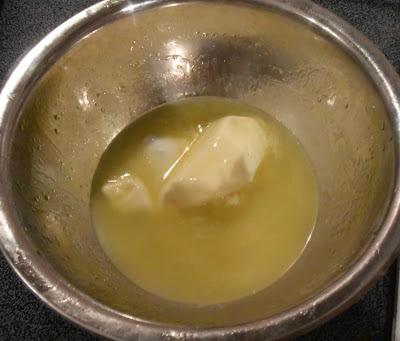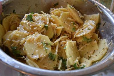Αδειάζουμε σε μπολ τις πατάτες από τα φορμάκια και ρίχνουμε από πάνω όλα τα υλικά μαζί και το λιωμένο βούτυρο .