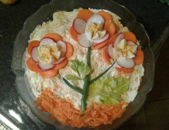Vanessa Kolovos Υλικά 15 μερίδες 4 κιλά πατάτες κίτρινες 2 καρότα τριμμένα χοντρά (περίπου 1 – 1 1/2 μέτρια κούπα) Σέλινο κομμένα σε λεπτές φετες (περίπου 1 – 1 1/2 μέτρια κούπα) 6 φρέσκα κρεμμυδάκια ψιλοκομμένα σε φέτες 4 αυγά βραστά σφιχτά και τριμμένα χοντρά στο τρίφτη 1 1/2-2 μέτριες κούπας μαγιονέζα (περίπου) Αλάτι της γεύση Άσπρο πιπέρι της γεύση Για το Στόλισμα 2 βραστά αυγά Λεπτές φέτες καρότο και λίγο τριμμένο χοντρό στο τρίφτη Λεπτές φέτες ραπανάκια Κλωνάρια από φρέσκο κρεμμυδάκια Φιλαράκια από σέλινο Λίγο γλυκιά πάπρικα να πασπαλίζετε για χρώμα