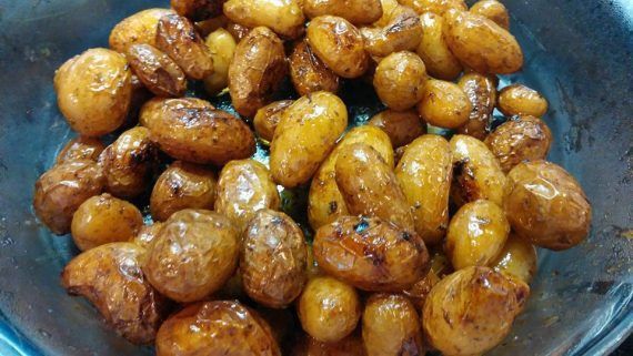 Υλικα 2,5 κιλα πατατες μικρες ολοκληρες ελαιολαδο αλατι 1 ποτηρι φυσικο χυμο πορτοκαλιου θυμαρι και λιγο ψιλοκομμενο σκορδο προεραιτικα ΕΚΤΕΛΕΣΗ Πλενουμε καλα μια μια τις πατατουλες με την φλουδα τους! Τις βραζουμε σε μπολικο νερακι με λιγο αλατακι! Τις στραγγιζουμε καλα και τις βαζουμε στη λαδοκολλα με λιγο λαδακι .το χυμο πορτοκαλιου, το θυμαρι και λιγο σκορδακι! Τις ψηνουμε στους 200β χωρις να τις ανακατέψουμε μέχρι να μελώσουν και να ξεροψηθούν απο πάνω!