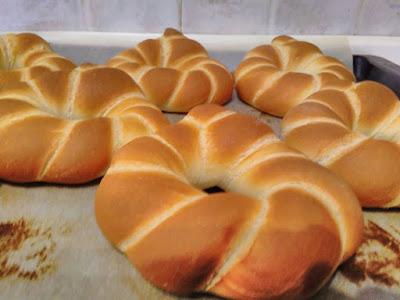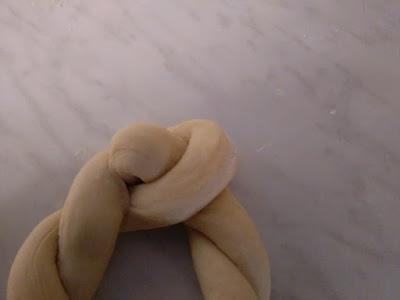 Περνάμε την άκρη μέσα στην τρύπα της άλλης άκρης και δημιουργούμε κουλουρίτσα. Αφήνουμε να γίνουν για 30 λεπτά με 40 και φουρνίζουμε στους 190 βαθμούς για 20 με 25 λεπτά περίπου.