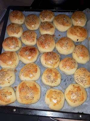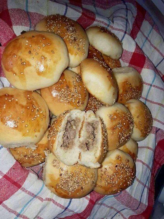 Ζυμώνουμε όλα τα υλικά μαζί αφού πρώτα έχουμε διαλύσει την μαγιά σε λίγο χλιαρό νερό . Αφήνουμε την ζύμη για 1 ώρα να φουσκώσει μετά κάνουμε μπαλάκια τα αφήνουμε αλλά 15 λεπτά μέχρι να κάνουμε την γέμιση μετά ανοίγουμε με το χέρι. Βάζουμε γέμιση κλείνουμε τα περνάμε με αυγό και με σουσάμι τα αφήνουμε άλλη μισή ώρα και ψήνουμε στους 180 βαθμούς πάνω κάτω Για την γέμιση ότι Θέλουμε βάζουμε εγώ έβαλα κιμά με κρεμμύδι τα τσιγάρισα αλάτι μπαχαρικά και έτοιμη!!!!