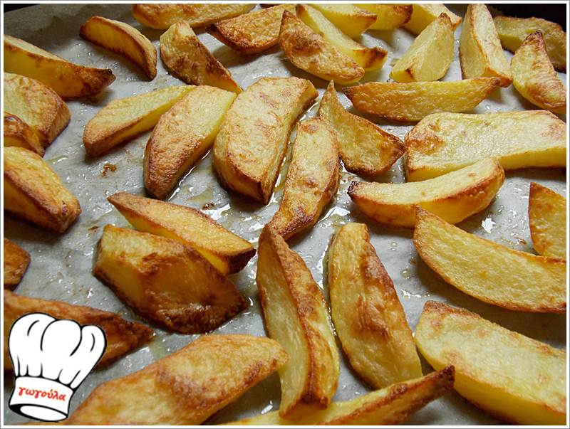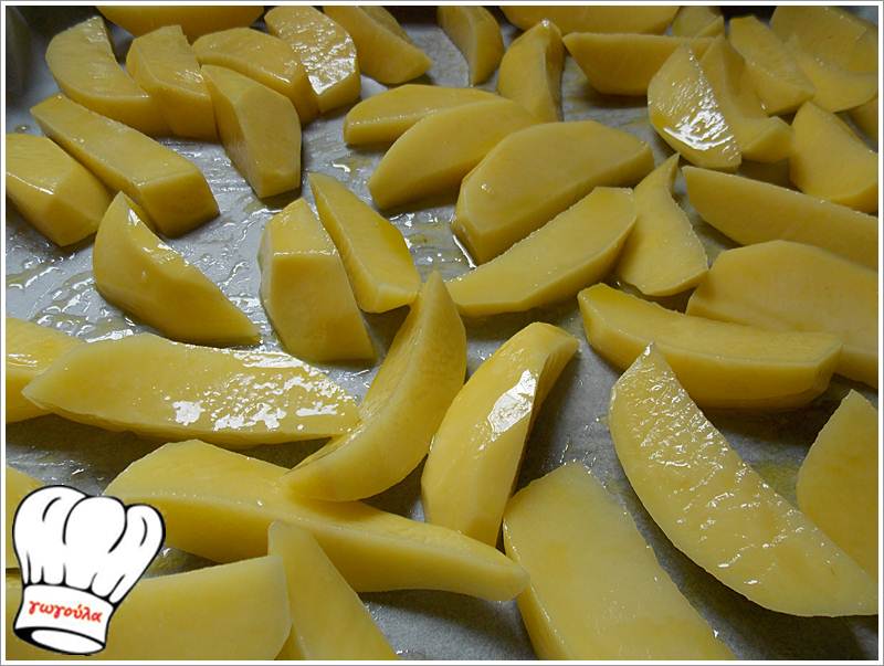 Κοβουμε και τις πατατες τις αλατιζουμε τις λαδωνουμε πολυ καλα και τις στρωνουμε σε λαμαρινα του φουρνου οπου εχουμε τοποθετησει λαδοκολλα