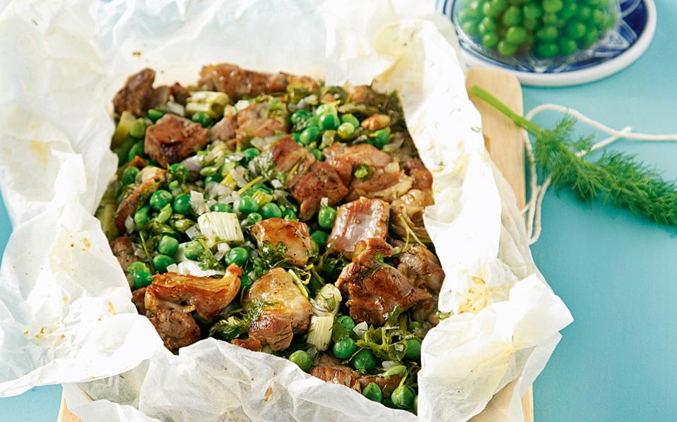 Αρνί ξεκοκαλισμένο στη λαδόκολλα με αρακά