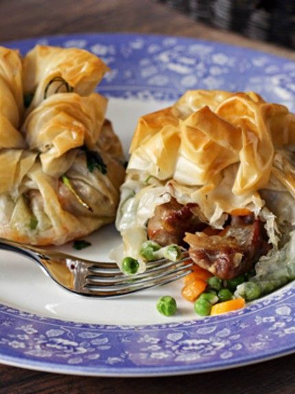 Παίρνετε δύο φύλλα κρούστας, τοποθετείτε το ένα επάνω στο άλλο και τα κόβετε στη μέση κατά πλάτος. Στη μέση κάθε κομμένης επιφάνειας τοποθετείτε από τέσσερις πέντε κουταλιές μίγματος αρνιού, λαχανικών και τυριού. Κλείνετε τα φύλλα προς τα επάνω και τα συγκρατείτε με ένα μαλακό κοτσανάκι σέλινο (ζεματισμένο σε νερό που βράζει).
