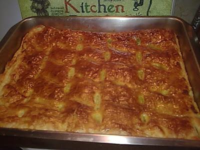 Σκεπάζω με το άλλο φύλλο και αφού την κλείσω γύρω γύρω καλά ,την χαράσσω μπακλαβωτα και βάζω σε ένα κουπάκι λίγο λάδι μισή κούπα κ λιγότερο λάδι και ένα κρόκο αυγού το ανακατεύω καλά και το ρίχνω πάνω από την πίτα να παει παντού,ψήνω στους 170-180 βαθμούς!! Πολύ νόστιμη !! ! Καλη επιτυχια!!!