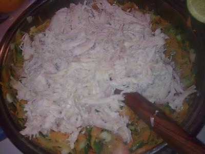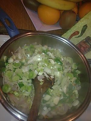 Βάζουμε σε ένα βαθύ τηγάνι το λάδι με το κρεμμύδι .μετά προσθέτουμε και τα φρέσκα κρεμμυδάκια [μην αρπάξουν]προσθέτω τα πράσα,το καρότο βάζω και αλάτι πιπέρι και τα γυρίζω με την κουτάλα την ξύλινη μέχρι να μαραθούν προσθέτω μοσχοκάρυδο αλατοπίπερο,το κοτόπουλο ψιλοκομμένο κ ανακατεύω ,αποσύρω από την φωτιά χτυπώ 2 αυγά και τα προσθέτω καθώς και το τριμμένο τυρί. Ανακατεύω και ετοιμάζω το ταψί ,το λαδώνω και βάζω το ένα φύλλο σφολιάτα στρώνω ωραία ωραία την γέμιση .